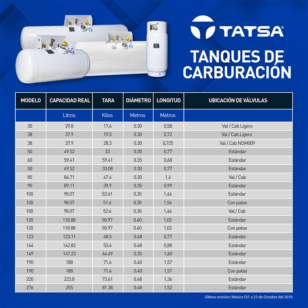 Fabricados de acuerdo a nom y código asme con materiales de la mas alta calidad. Acabado pintura en polvo con aplicación electrostática horneada tipo poliéster color blanco. Presión de diseño 250 psi. En tatsa contamos con 65 años de experiencia en la fabricación de contenedores para gas.
